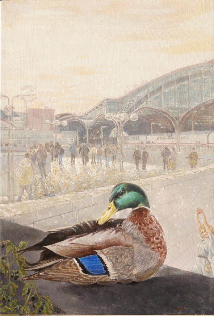 Erinnerung der Ente, 2025, Öl und Tempera auf Nessel, 70 x 48 cm, 2025